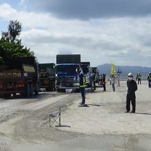 今日總計253輛砂石車分成三批次進入。填海造陸用的砂石無法從陸地上搬運,因此推測這些送來的建材是用於建造基地內的軍營或是工程便道的。今日有來自京都的退休教職員工會人員,最高集結人數達到了90人。