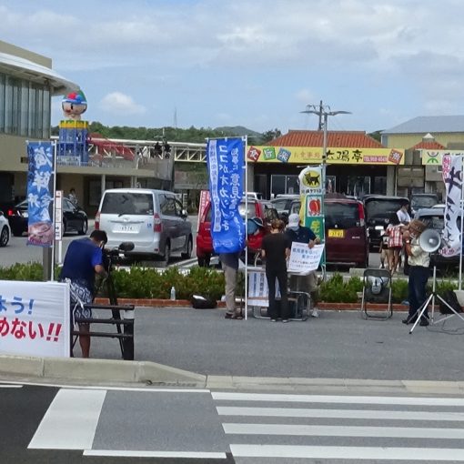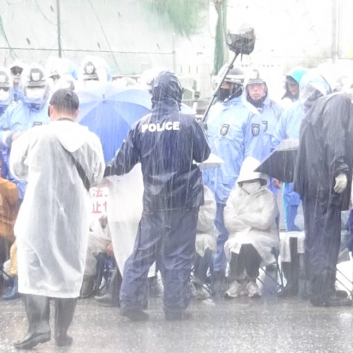 早上九點,有十幾個人靜坐。機動隊輕鬆地就將人們排除完畢,水泥攪拌車和砂石車一輛接一輛地駛入基地。高里鈴代女士以十來分鐘的演說,對著基地真切地訴說了沖繩的歷史、新基地計畫的來龍去脈、由此而來的危險性,以及沖繩女性因此被迫面對的情況。機動隊、防衛局職員、警備員……在清一色站滿男性的基地大門前,飄溢著女性特有的溫柔、感染人心的演講。這是否能傳達到他們的心中呢? 233輛次的車將建材搬入了基地內。