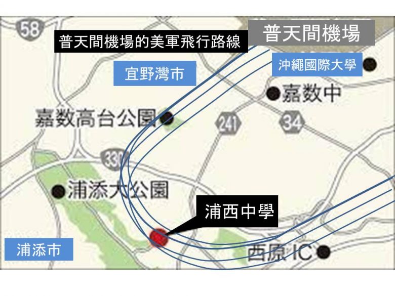 五日,美國海軍陸戰隊證實,在臨近美軍普天間飛行場的浦西中學內,從天空掉落的橡膠物件是美軍軍機上的物品。此橡膠是裝置在隸屬普天間機場的大型輸送用直升機CH53E螺旋槳上的一部分,重約20克。2017年末,在普天間基地周遭的小學及幼稚園曾接連出現軍機物件掉落的事件,這次又發生在小學校園內,引發了縣民巨大的不安與憤怒。五日,日本政府、沖繩縣及浦添市政府接連向美軍提出停止飛行同款直升機的要求。