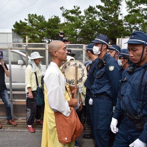 今天是五日行動的第一天。大門前以及安和、鹽川棧橋前聚集了許多抗議群眾,卻在早上7時的時間點發生工程暫緩「超乎預期」的狀況,參與者得知後如釋重負的聲音在抗議現場此起彼落的散開。安和棧橋的大門依然緊閉,無法看到棧橋內的動靜。在鹽川棧橋亦沒有出現民間警備員與景觀的身影。因早已得知前一天沒有工程的情報,施瓦布營區大門前,早上我們的人稀稀落落。中午時分,亞太美國勞動者聯盟(APALA)的全美代表20人到訪,以演講與唱歌鼓舞群眾。他們不僅也一起靜坐,還一同呼喊「超乎預期」。