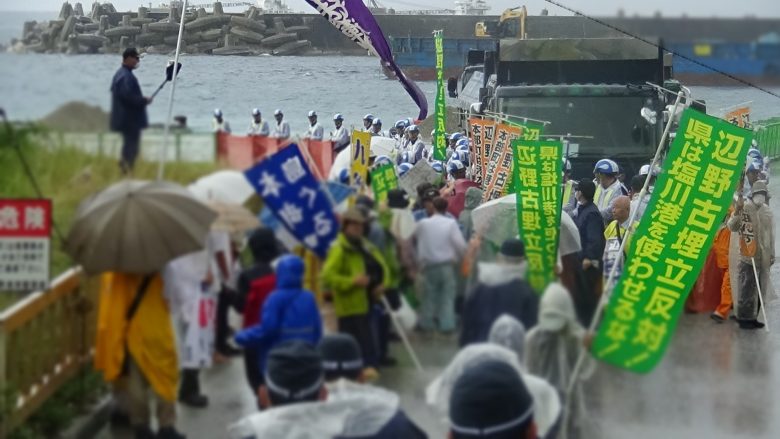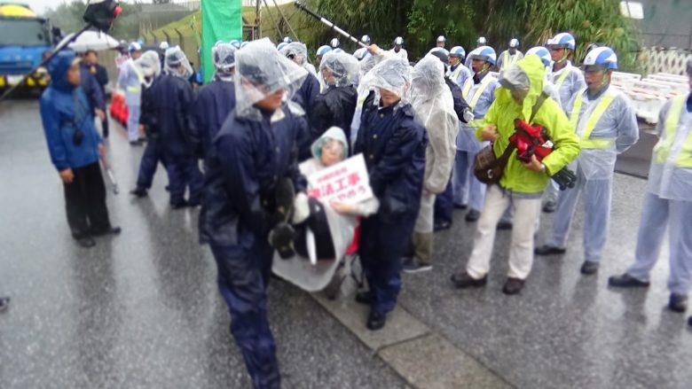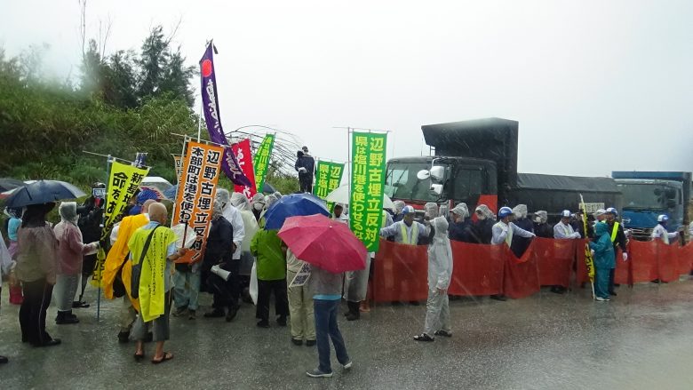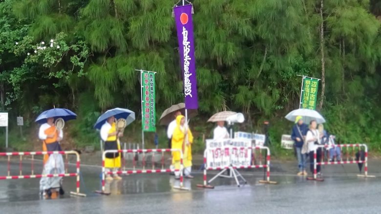 滂沱大雨中,日本山妙法寺的8名僧侶參與者敲擊著太鼓,鼓聲環繞著參與者及抗議行動現場。與訴願和平的佛教徒想法大相逕庭的機動隊員、防衛局職員連成一線,拼命地戒護使搬運資材的車輛能夠順利的進入基地。防衛局的2名年輕女性職員,手持麥克風從基地內重複的不知道在叫喊甚麼,雖說是受命行事但該2名女性似乎不知道自己在幹什麼吧。市民40人約莫20分就被驅離了,而今天,共有159輛的資材被運進基地。