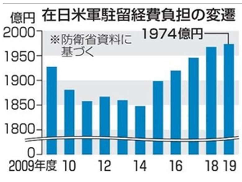「日美軍駐留經費負擔」在1978年當時的防衛廳廳長金丸信是如此表示的,「報以仁義之心接待美軍」其駐留日本的經費一部分決定將由日本負擔。然而,基地內所有的水電費、裝修費、日本籍員工的薪資等,日本承諾部份負擔的支出是逐年的持續增加中;對此,不僅日本,韓兩國政府也斷然拒絕美國如此過分的要求。