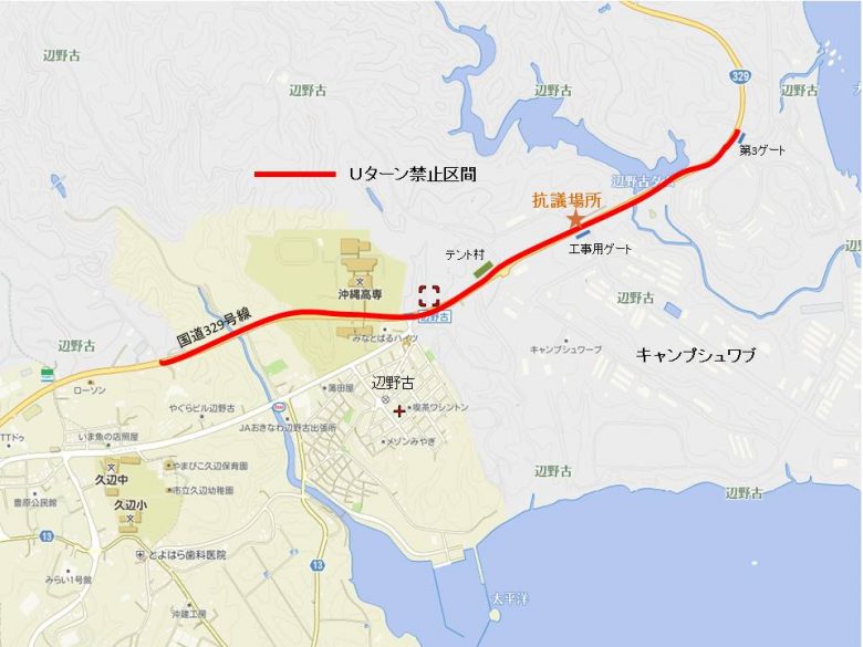 沖繩縣警察於本月18日,禁止用路人在靠近Camp Schwab大門附近的部分國道(329號)道路上迴轉,禁止區域以帳篷村為中心往東西向擴大至2.5公里之長,無非是針對基地反對運動所的規定!沖繩縣警察局交通課卻表示「一切是為了防止事故發生以及順暢交通」,然而往返只有這一條道路警方卻仍頒布這樣的規定,這也只會造成用路人莫大的困擾而已。此規定的頒布迎來居民一面倒的反彈聲浪,基地反對運動的領頭者賴長和男先生怒斥「警察竟然公權力幫兇到如此的地步!」