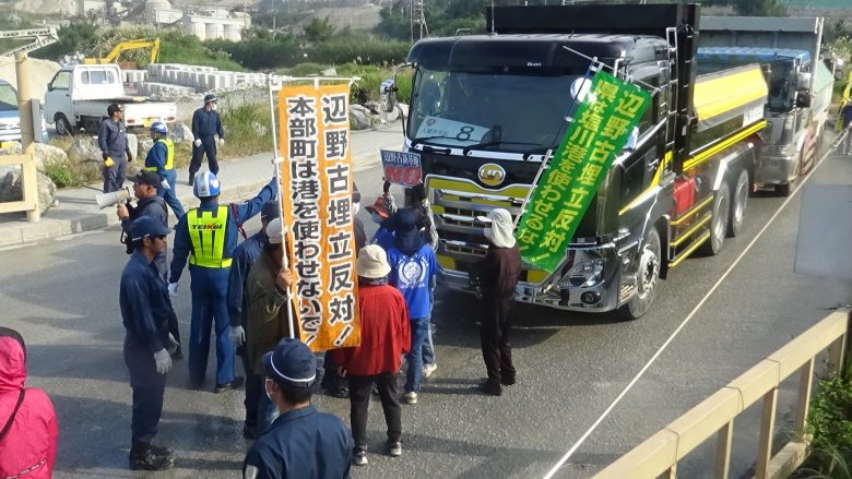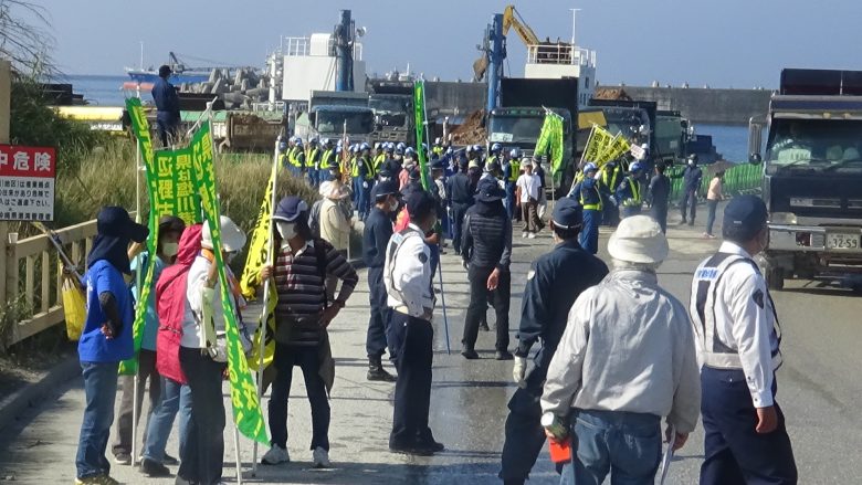 早上7點過後,開始土砂搬入作業,5位阻擋在傾倒車前面,在機動隊9點20分出動前,阻止了傾倒車。在那之後,30多人加入了抗議行列,阻礙了自由到處來回進出棧橋出入口的傾倒車的行進。市民約40位,機動隊員約40位,在棧橋內成為混亂的場面。傾倒車搬入了238輛土砂,如果沒有抗議的話,應該會有兩倍以上的量。大成功!