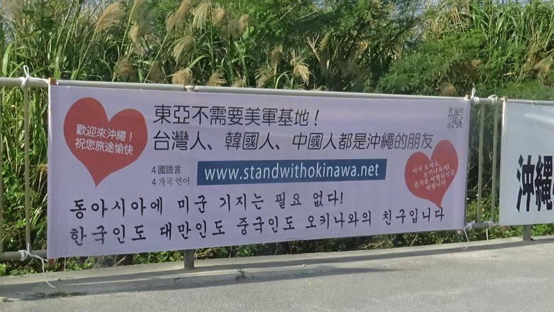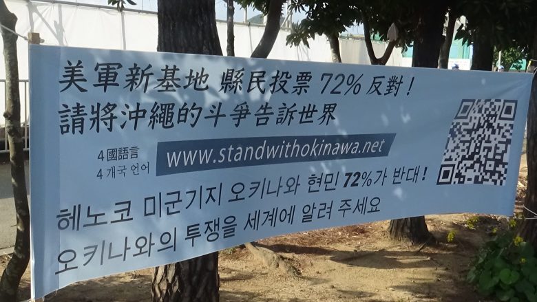 沿著安和港、塩川港的國道,貼著2張用中文和韓文寫著的橫布條。因為很多台灣人,韓國人,中國人搭乘著觀光巴士去美麗海水族館,為了給他們看,所以我們沖繩和平support製作了這些橫布條。橫布條上寫著「東亞不需要美軍基地/台灣人韓國人中國人是沖繩的朋友/好好享受沖繩的旅行」「美軍新基地 縣民投票72%反對/將沖繩的抗爭擴展到世界各地」,掃描QR CODE就可以連結到我們的網頁。沖繩的美軍基地問題也關係著東亞的和平。要讓更多的觀光客知道目前沖繩的問題,為了東亞的和平,希望能共有邊野古新基地建設問題。