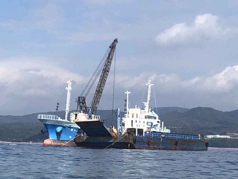 風也是波浪也是都很平靜的一天。抗議船一艘,獨立舟8艇,出發去抗議。確認了從土砂搬運船到駁船的重裝土砂和在K8K9護岸被裝上岸的土砂投入到填海造地的區域。去到作業現場抗議的途中,獨木舟全員被海上保安官拘束,帶回到海邊。