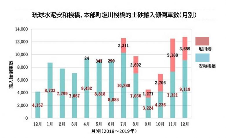 前年12月開始,將土砂投入到填海造陸區域的傾倒車輛數,可以從市民的監督資料中得知。到去年12月底為止,安和棧橋,塩川棧橋的搬入輛數合計11萬4601輛。一天平均約410輛。因為颱風的關係而多次停止作業的9,10月有大幅的減少。11月之後推算為約每個月1萬3000輛左右。