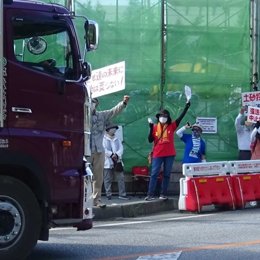 "GoGo Dirver"成員為了阻止從棧橋內出來的砂石車奮力地阻擋抵抗,短暫的使數十輛和近10輛的砂石車阻塞在棧橋內和道路上。貌似防衛局人員的男性,煩躁的在交班的時候指著市民並口出惡言「不想浪費時間搭理你們這些愚蠢之人」。聞此,市民氣憤的抗議「竟敢出口辱罵我們(抗議的市民)愚蠢!」,而該口出惡言的防衛局人員兩步併兩步的進入了棧橋內。奮力的抗議行動下仍有559輛的砂石被運入。