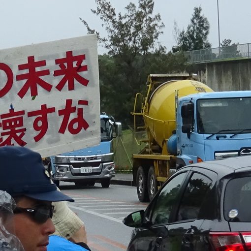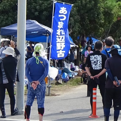 宇流麻市、系滿市的群島成員大約有50人參加。一邊唱著歌一邊向著砂石車前進、高舉著「不要丟入紅土」等標語持續抗議著,從嘉手納町前來參加的比嘉幸次郎(80歲)拿著麥克風說著:「說是為了要建一個替代基地而來邊野古建造基地,那到時是不是真的會歸還普天間基地啊?不論是嘉手納、普天間、還是邊野古,都不需要基地啊。」722台砂石車份量的砂石被載運上3艘砂石搬運船。
