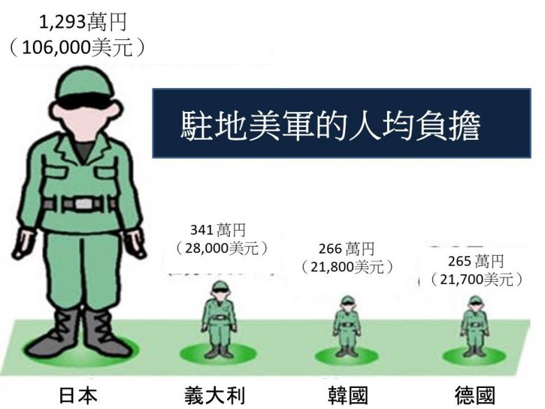 根據新聞報導,發現日本政府對美軍駐留所負擔的「體恤」金,跟其他國家比起來是完全領先的多。美國政府對同盟國27國的報告指出,日本對美軍駐留的負擔金額於2019年增加到1974億日幣,從韓國、義大利、英國的5倍漲到了20倍。對駐留美軍的「體恤」除含有,原本無義務負擔的基地工作人員的勞務費和水電瓦斯費、訓練費外,甚至還有美軍眷屬用的豪華住宅以及基地內的娛樂設施。換算成駐留美軍平均一人的費用,日本1293萬日幣是義大利和韓國的3.8~4.8倍。針對美軍駐留費用的負擔比例,日本是74.5%最多。韓國40%,而德國是32.6%。