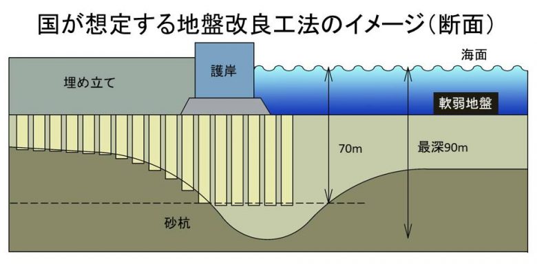 根據防衛省的計畫變更,為加固護岸下方的軟土,將採取以11000枝砂樁打入海盤的工法,改善工期為四年一個月。此工程進行需要特殊的作業船,但從政府在25日的國會質詢中得知,原先在國內的15艘作業船減少為10艘。能夠處理70公尺以上深度的作業船僅有3艘。本來數量已經很少的國內作業船若集中在大浦灣的話,這段期間國內其他同樣的改善工程將無法進行。而且深達90公尺的軟弱土地基改善工程是世界前所未見的首例。但不斷說著「邊野古是唯一一個」的美日政府,如流水般耗費稅金、會堅持新基地建設到什麼時候?已經能看出結論了。