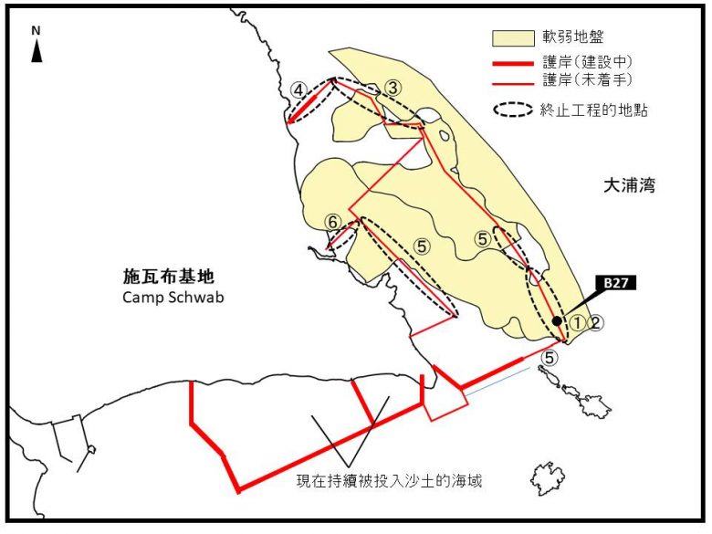 根據《赤旗報》(日本共產黨中央委員會發行的全國性機關報)的刊載,護岸工程開始至今已經有5年之久,有6項是在尚未實行的狀態下終止契約;而3月底終止契約的是,2014年度發包護岸以及混泥土塊等6項的新工程,契約總價約為410億日圓。