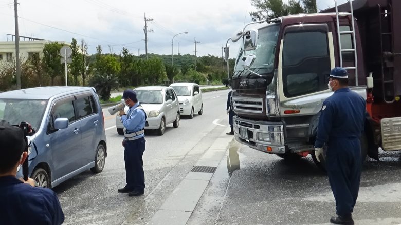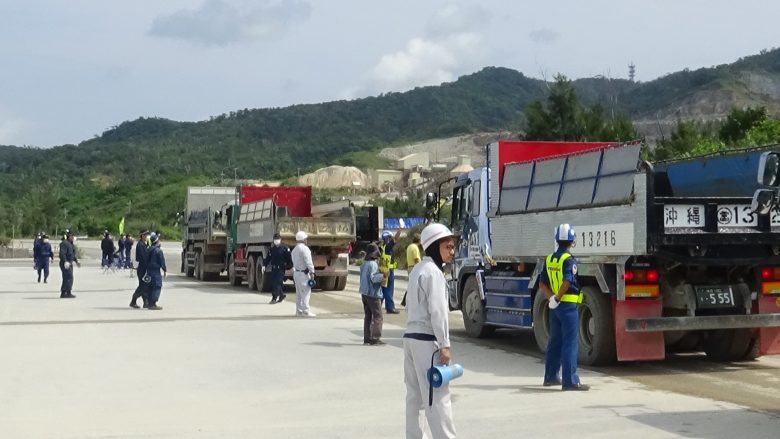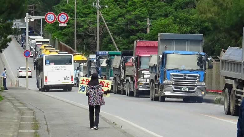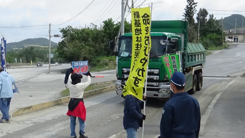 "宇流麻(うるま)"全島成員共13人,早上7時逾刻便趕至現場聲援抗議行動,以人肉阻擋駛向安和棧橋的砂石車以及鹽川港內的砂石搬運工程。機動隊直至8時50分才抵達,在這之前阻止了逾1小時的搬運作業。在參與者眾多齊聚抗議的星期一,成功延宕工程的進行,而從機動隊看似消極的作為,肯定他們也已經厭倦了一早的出勤吧。今日,仍有319輛的砂石被搬運至貨船上。