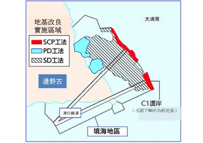 改良大浦灣旁66.2公頃的地基。使用三種工法打進約7萬1千支砂樁。