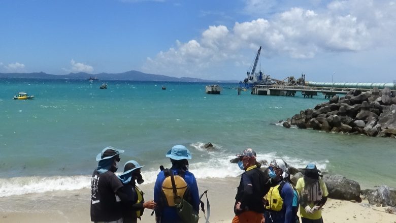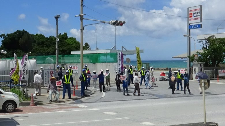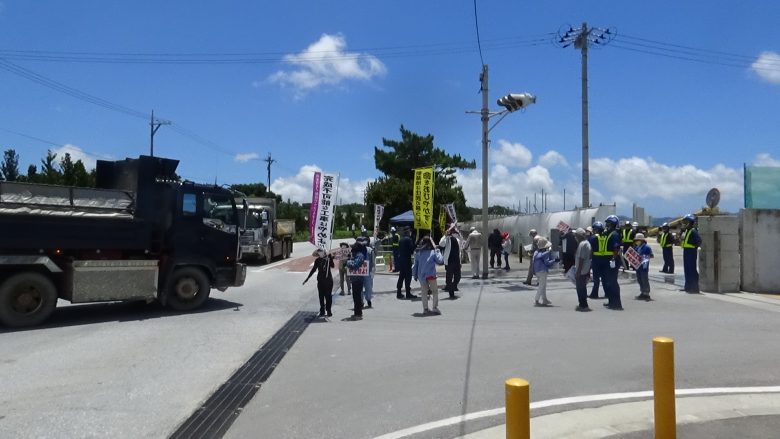 在強烈的日照下,約有20人在入口處進行了抗議遊行,他們對著搬運土砂進入的卡車高喊「不要用土砂破壞大海!」「不要參加違法的施工!」另外,有5人在卡車前緩慢地行走以延緩卡車的運行。今天共有795車的土砂被搬上了4艘 搬運船。自6月15日施工重開後,土砂搬運的工作每天都進行到晚上8點左右。