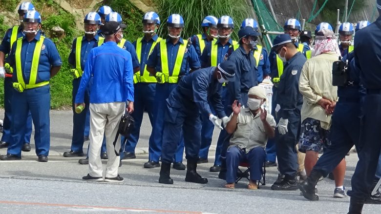 約有30人從早上8點開始進行靜坐。美軍駐沖繩基地內再次出現了新冠病毒的感染者,對美軍不公開詳細信息的行為,市民們表示強烈的不滿。他們高喊「假如不公開信息的話就應該封鎖基地」。今天上午下午一共分3次運入了207輛車的建材。