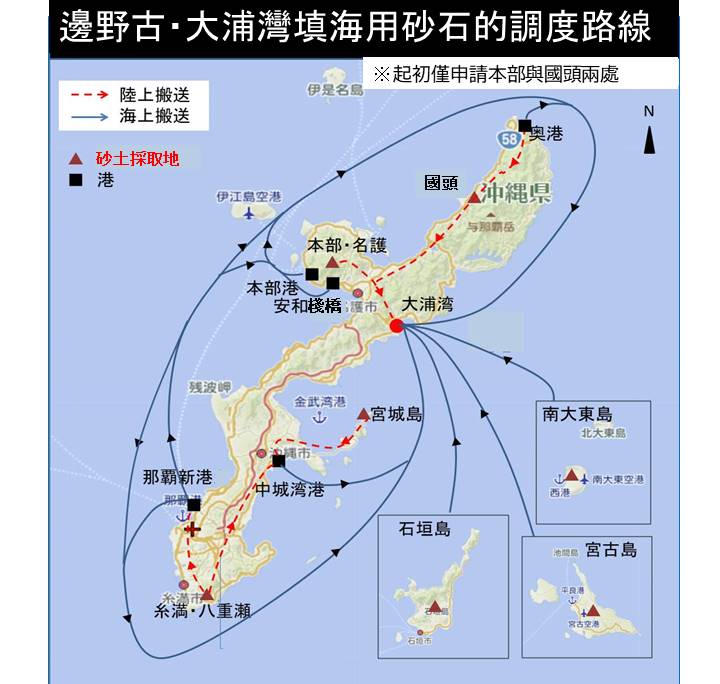 透過沖繩防衛局向縣政府提出的設計變更申請書,建設新基地所使用的砂石將改成由沖繩縣全域供應一事明朗化。這是方針的一大轉變。在原本的申請書中是打算其中七成的砂石要由日本本土如九州和瀨戶內等地透過海運過來的。這樣的方針轉變,可以視為是為了要閃避沖繩縣為了防止外來生物入侵而嚴格規範的「砂石條例」。