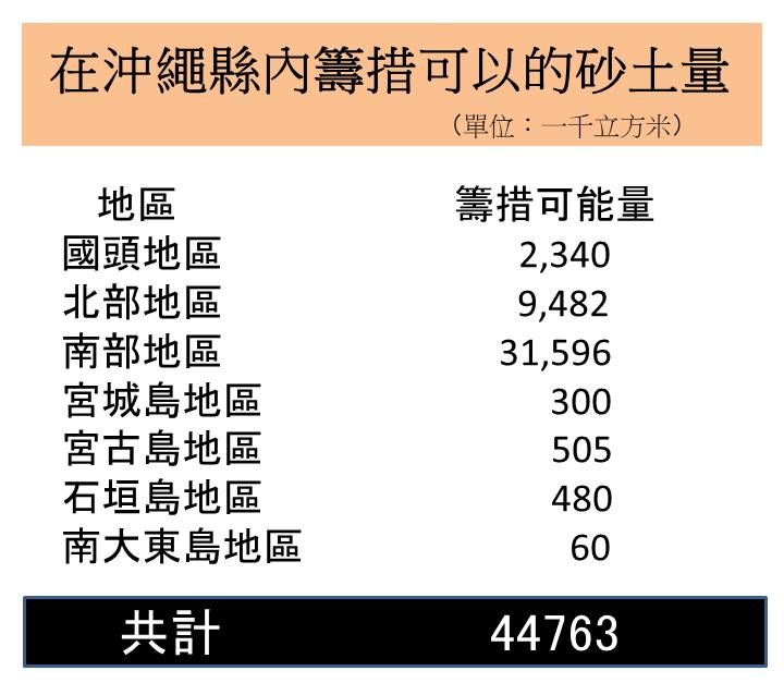 砂石供應地點將廣布沖繩全島,包含石垣島、宮古島和南大東島。在必要的砂石數量僅為2020萬立方公尺的情況下,將可能的調度的砂石量擴充自約4500萬立方公尺,這個調整,被認為是預料日後的工程將會因為市民的抗議行動和地方砂石採挖業者的拒絕承包等而進展困難,所以使供應地點變得更為彈性的對策。