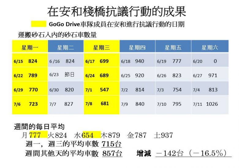 藉由在安和棧橋出入口的緩速行進,以阻礙砂石車的運輸,的「GoGo Drive」車隊抗爭手法在數據上顯示出了成果。在GoGo Drive成員出動的周一與周三,搬入砂石的車輛平均為715輛,而其它各日的平均則有857輛,GoGo Drive的抗爭成功使砂石車的運輸減少了142輛(約16.5%)。僅以10名左右成員組成的行動大幅度延遲了砂石運輸。當然,緊守著棧橋出入口的抗爭市民行動,也是成功牽制砂石運送的原因之一。對抗爭抱持自信心就對了。