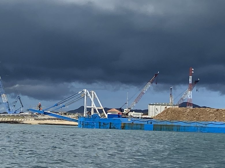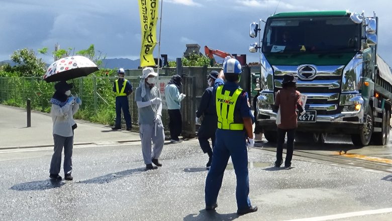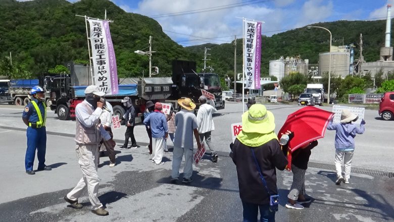 本部町全島會的數位成員進行了抗議行動。沒有出現縣警。共有514輛車的土砂被搬上了4艘搬運船,向著邊野古進發了。
