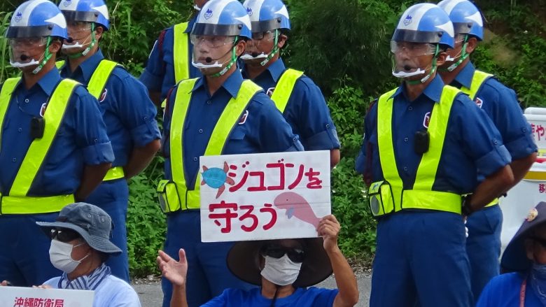 今天有2艘抗議船和8艘皮划艇出海行動。隊員們向著陸續進入大浦灣的4艘搬運船高喊「不要破壞大海!」「馬上停止違法施工!」等口號。當躉船要接近K8護岸時,皮划艇果斷地靠近躉船,接著,海上保安廳的警察集體出動,用30分鐘的時間抓住了所有隊員,將他們送回了岸邊。