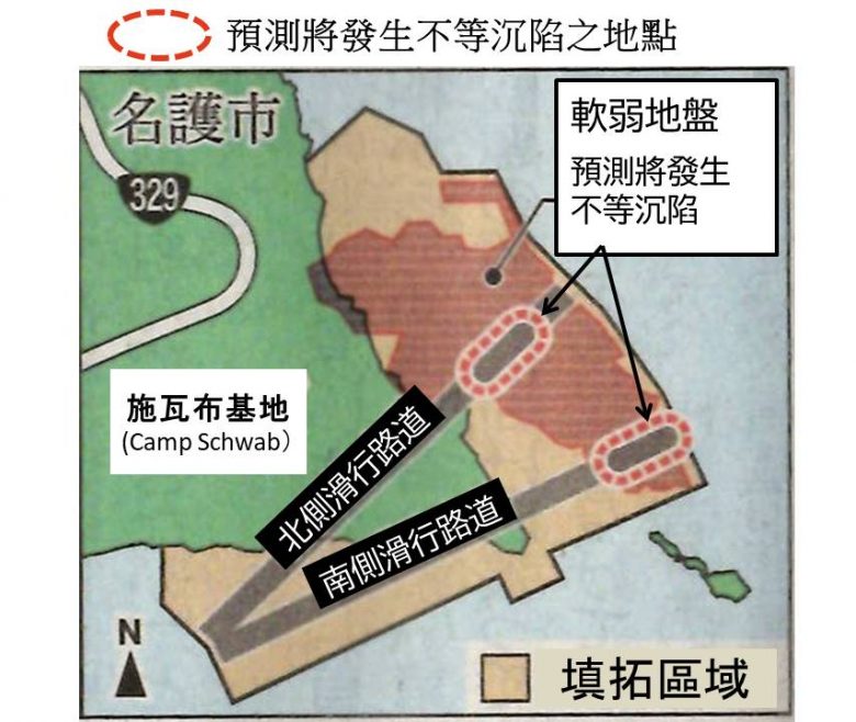根據防衛省的同一份資料預測,即使進行改良施工,地層下陷仍然會在20年後發生。北側飛機跑道最大會下沉8公分,南側則會下沉12公分,估計北側需要修補2次,南側則需要修補4次。