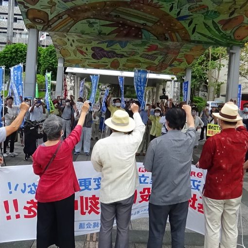 冲繩和平市民聯絡會的27名成員乘坐2輛小型巴士來到棧橋前。他們在棧橋的出入口高舉告示牌,向著運送土砂進入棧橋內的卡車不停地喊道:「不要破壞大海!」「立刻停止違法施工!」。