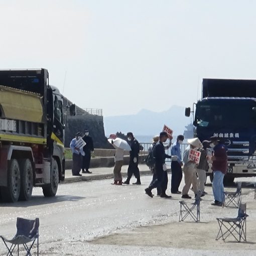 在淅淅瀝瀝的小雨中,沖繩和平市民聯絡會的10位成員在出口和入口處進行了抗議行動。因為有組織的抗議行動暫停了,接送市民的巴士也停運了。大家互相乘坐私家車來到棧橋前。為了讓卡車不能自由地進入棧橋內,10位市民在大門前持續進行了一天的抗議行動。