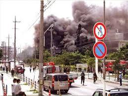 從普天間機場起飛的美國海兵隊的大型飛機墜落在沖繩國際大學校園內,並失火。