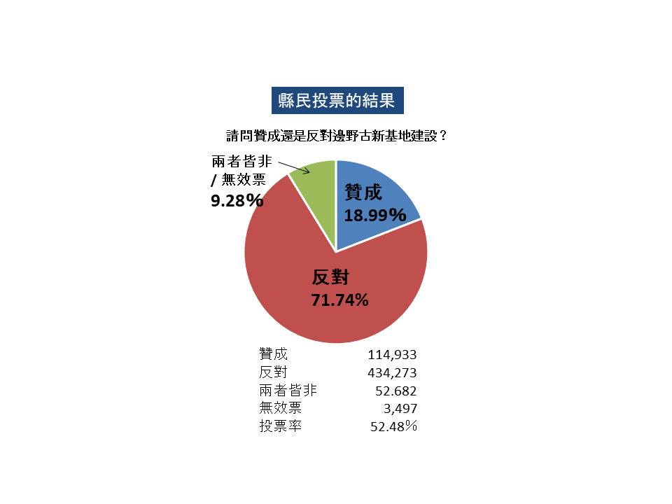 以「是否贊同為了邊野古美軍基地建設的填海造地之縣民投票條例」為題舉行了縣民投票表決,投票結果,反對票佔71.74%(約43萬票),再度明確顯示出縣民反對建立美軍新基地的意願。